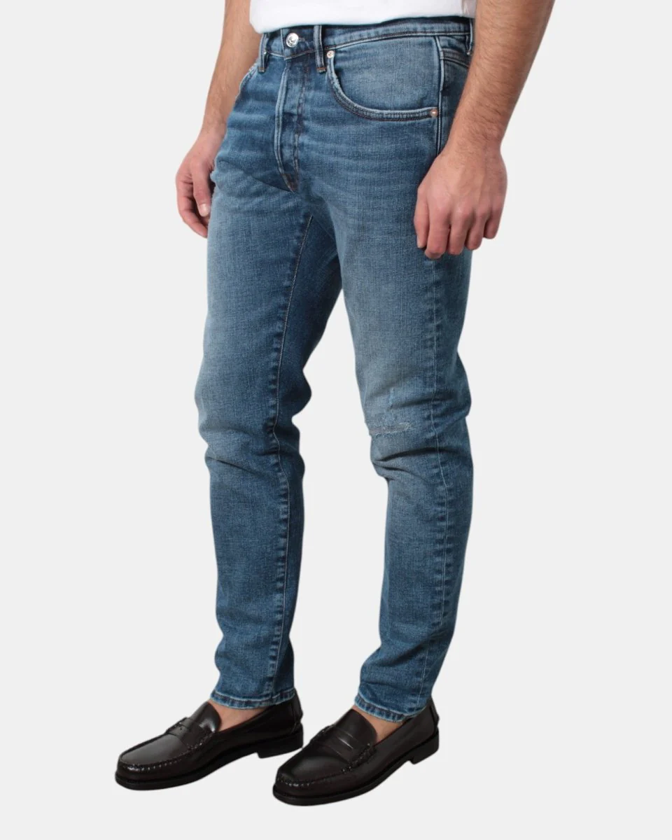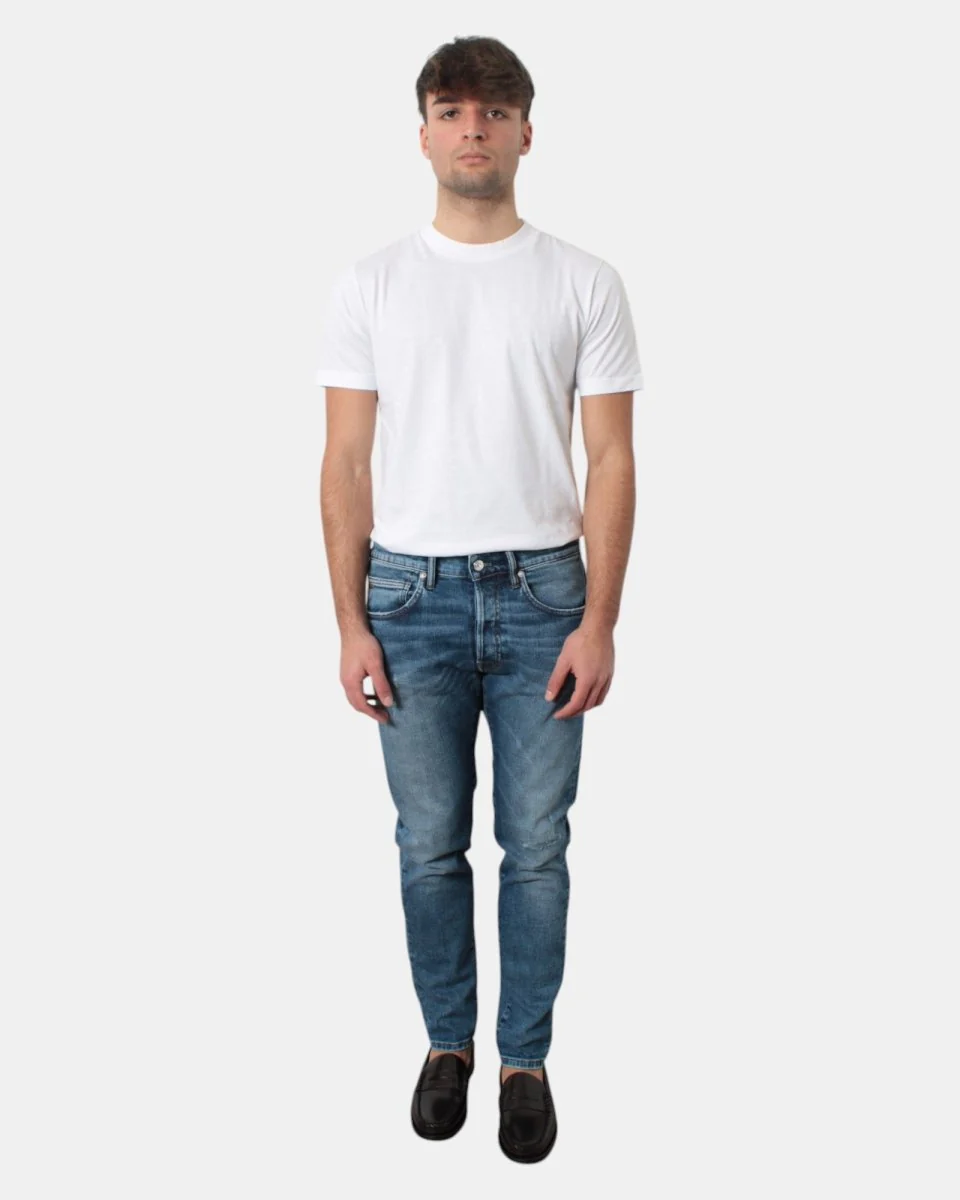 Il jeans di Nine in the Morning presenta rotture dovute al lavaggio leggermente chiaro, tasche frontali, due tasche a toppa sul retro con dettaglio logo brand, chiusura a bottoni. vestibilità leggermente over, dalla mano fresca dovuta alla sua composizione in 98% cotone e 2% elastan. Si consiglia lavaggio a massimo 30 gradi. Il modello è alto 1,78 m e indossa una 31