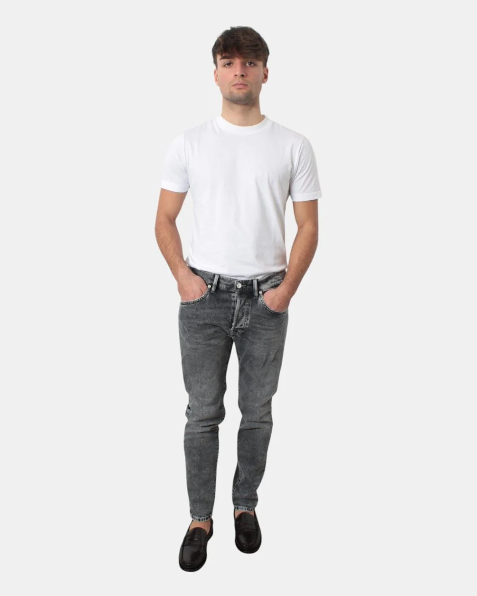 Il jeans di Nine in the Morning presenta colorazione grigia con cambi di tono, tasche frontali, due tasche a toppa sul retro con dettaglio logo brand, chiusura a bottoni. vestibilità leggermente skinny, dalla mano fresca dovuta alla sua composizione in 99% cotone e 1% elastan. Si consiglia lavaggio a massimo 30 gradi. Il modello è alto 1,78 m e indossa una 31