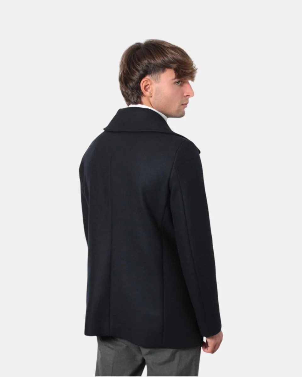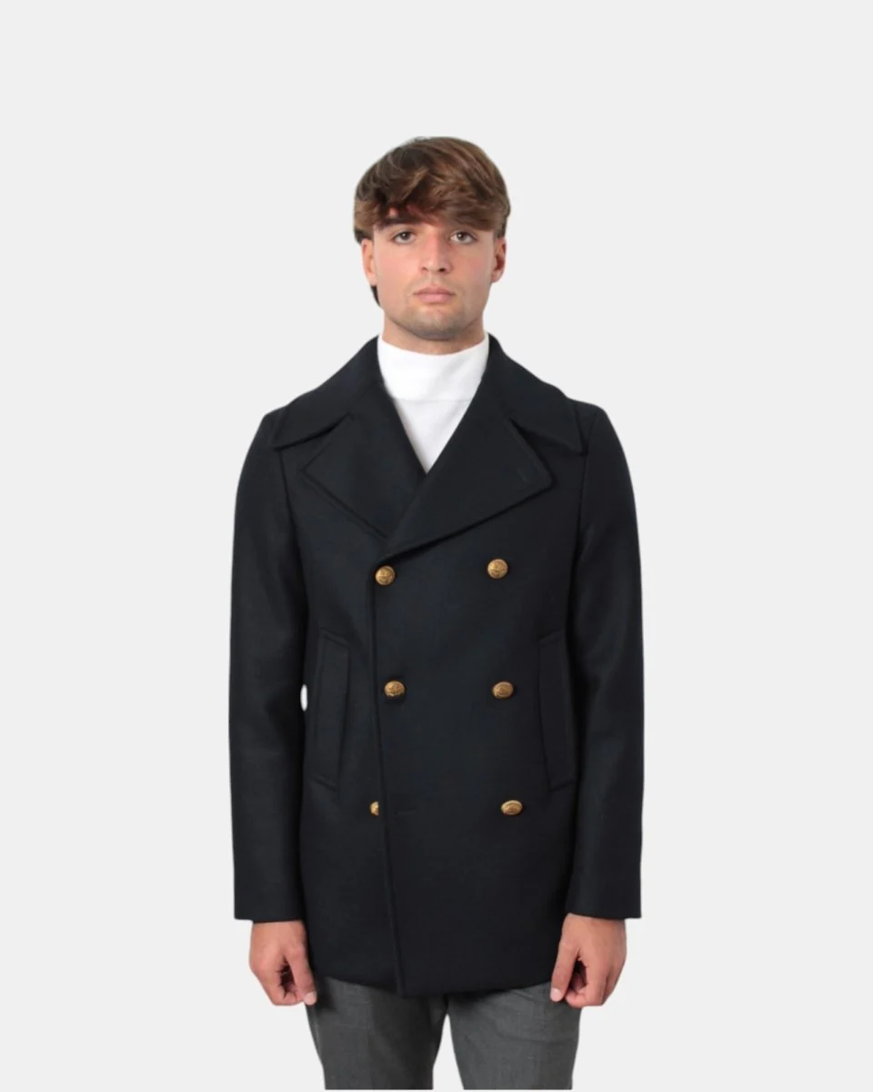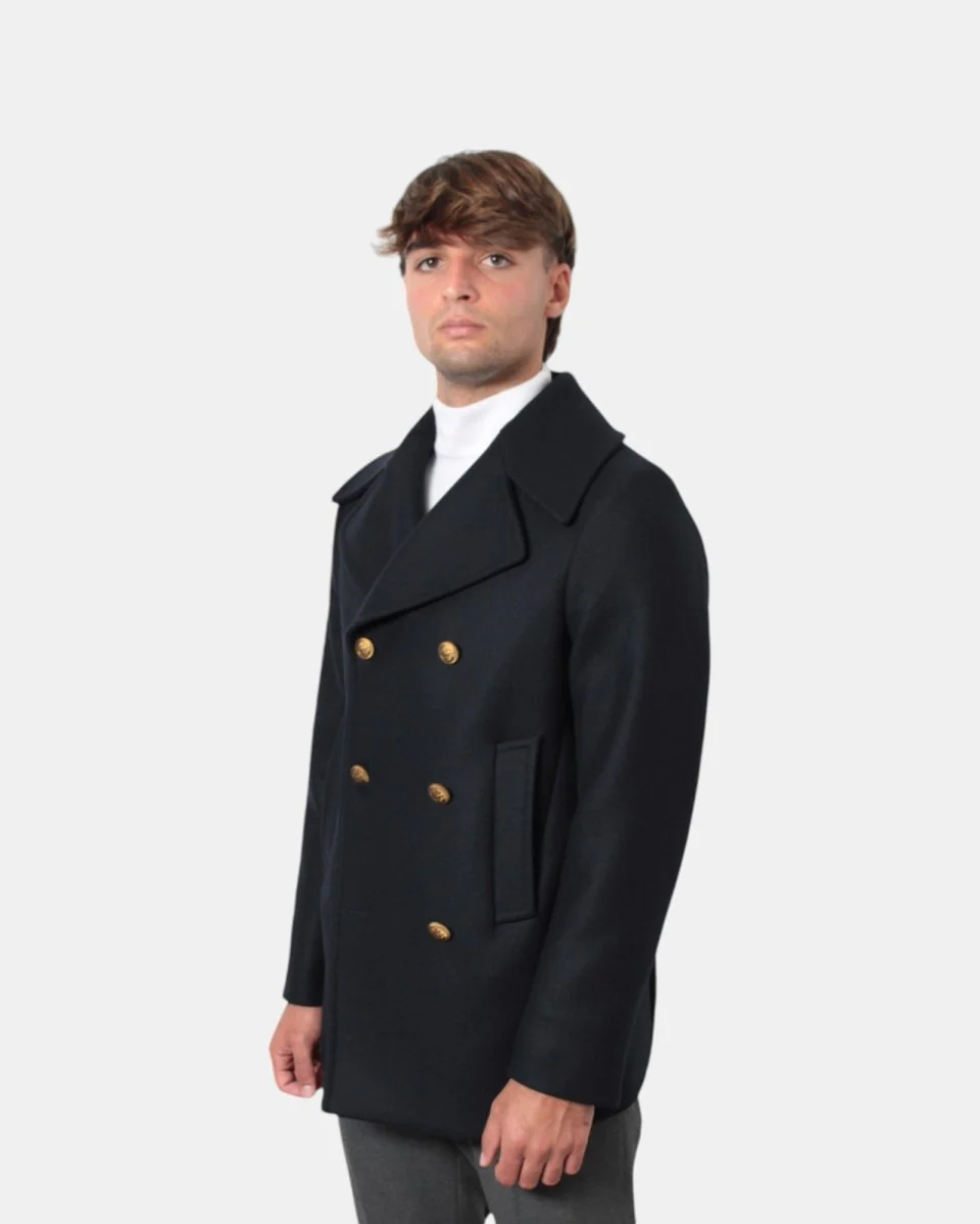 Capo dall’interno completamente foderato e con chiusura a sei bottoni in ottone e tasche a filo sul fronte.