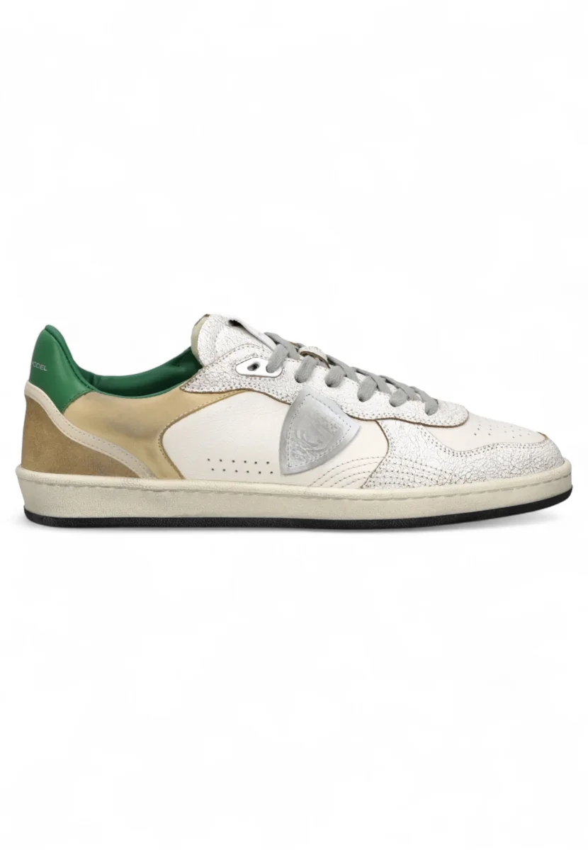 Dall’anima vibrante del quartiere Pigalle, nel cuore di Parigi, nasce Philippe Model PGAL: una sneaker low-top che fonde l’estetica vintage dei campi da basket anni ’80 con un design contemporaneo e ricercato. In questa versione grattata per un autentico effetto vissuto, la tomaia in pelle di vitello bianca liscia è impreziosita da dettagli in cracklè, spoiler verde e scudo a contrasto, che donano alla scarpa un’identità visiva forte e distintiva.