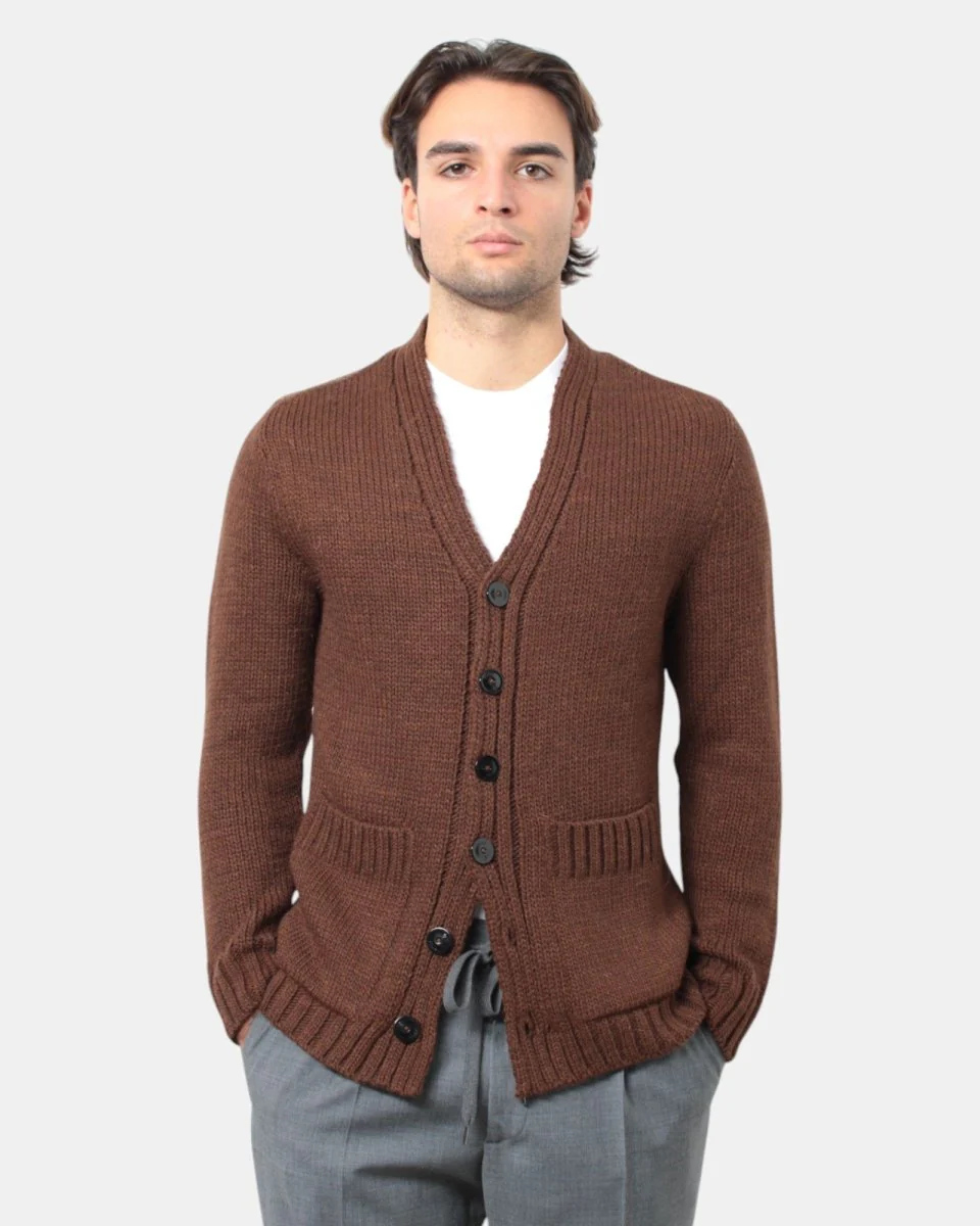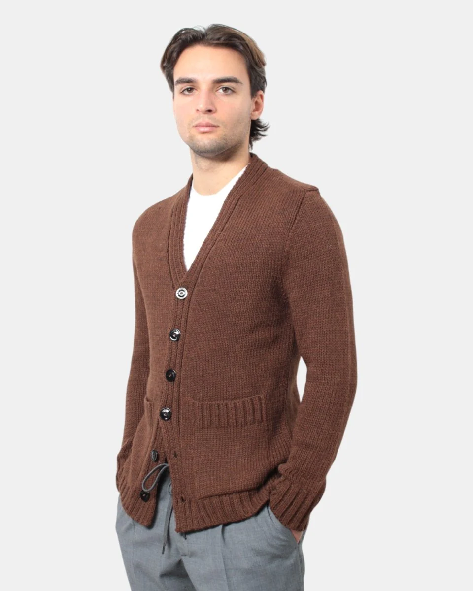 Il cardigan di PMDS presenta chiusura a sei bottoni frontale, due tasche a toppa con costine, collo, polsi e fondo a coste, fantasia a losanghe intrecciate sottili, dalla mano morbida e calda dovuta alla sua composizione in 50% poliestere, 30% lana, 10% viscosa e 10% lana di lama. Si consiglia il lavaggio a secco. Il modello è alto 1,79 m e indossa una M