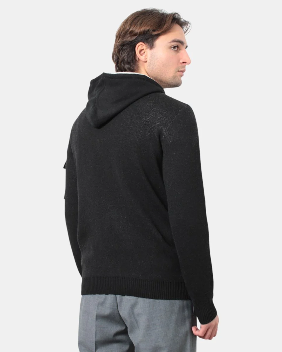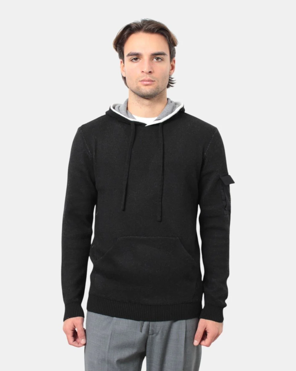 La felpa con cappuccio di PMDS presenta tascone centrale, taschino a filo con logo brand sul braccio sinistro, fondo e polsi a costine elastiche, collo a costine in contrasto di colore . La sua composizione è per il 50% in lana, 30% viscosa, 25% poliammide e 5% cashmere. Si consiglia lavaggio a mano. Il modello è alto 1,79 m e indossa una M