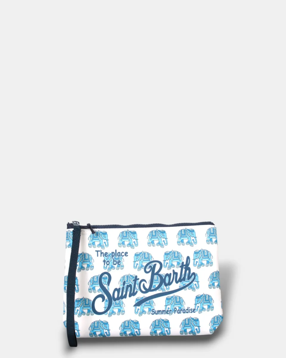 La pochette di MC2 Saint Barth presenta scritta brand su ambo i lati, fantasia con elefanti, zip in contrasto, composta in 80% sbr e 20% poliestere