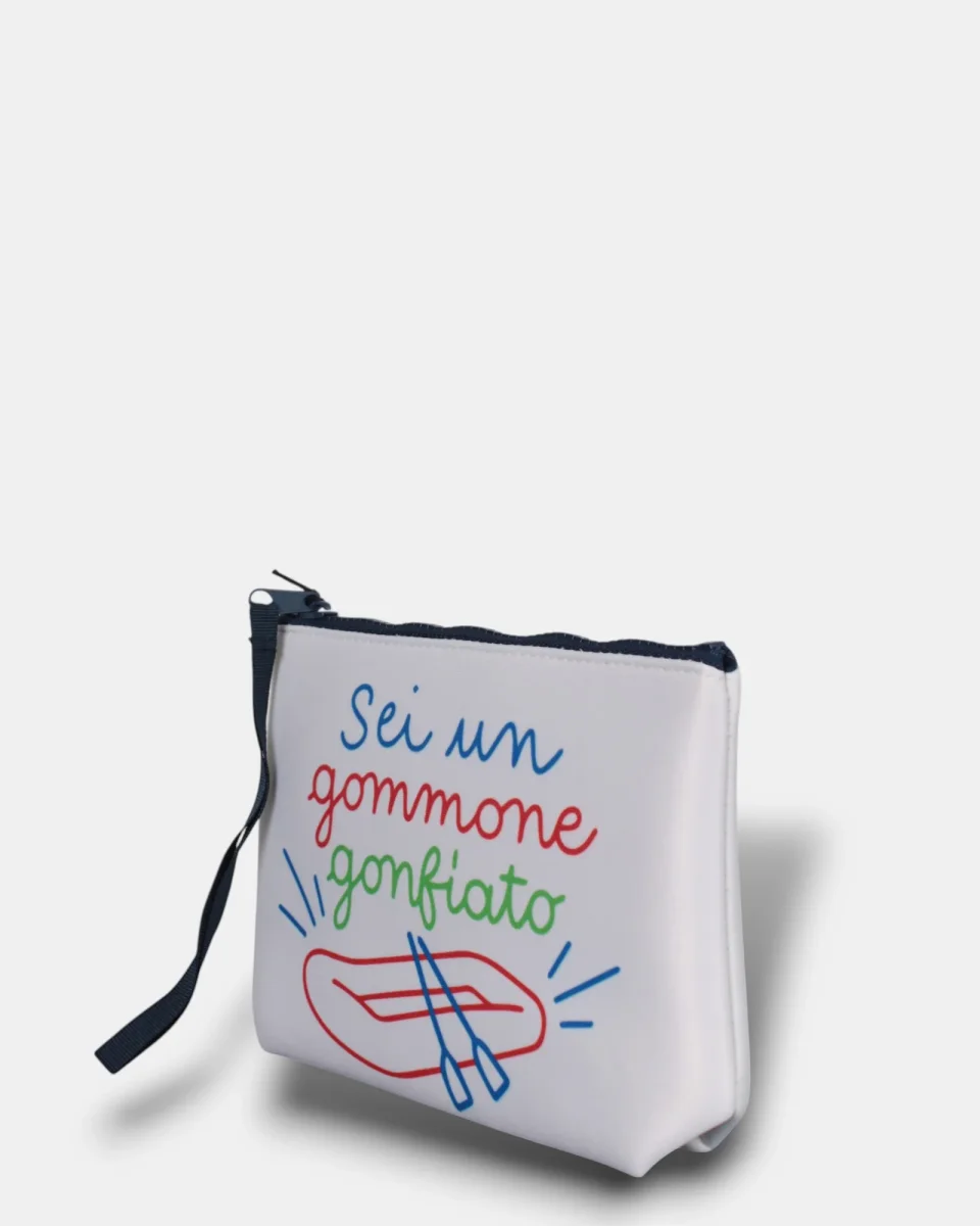 La pochette di MC2 Saint Barth in collaborazione con insulti luminosi , presenta logo con gommone sul fronte, e logo brand sul retro, zip in contrasto. Composta in 80% gomma e 20% poliestere.