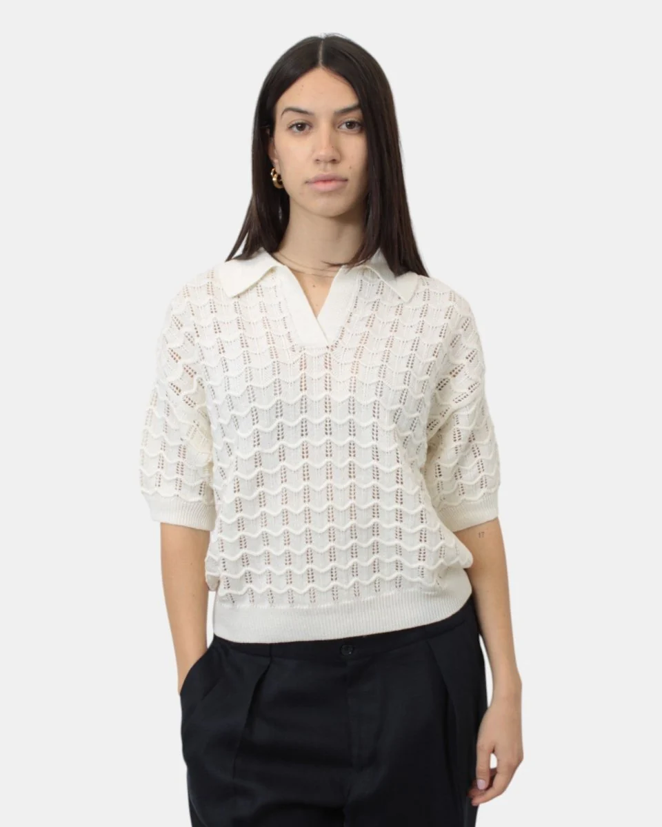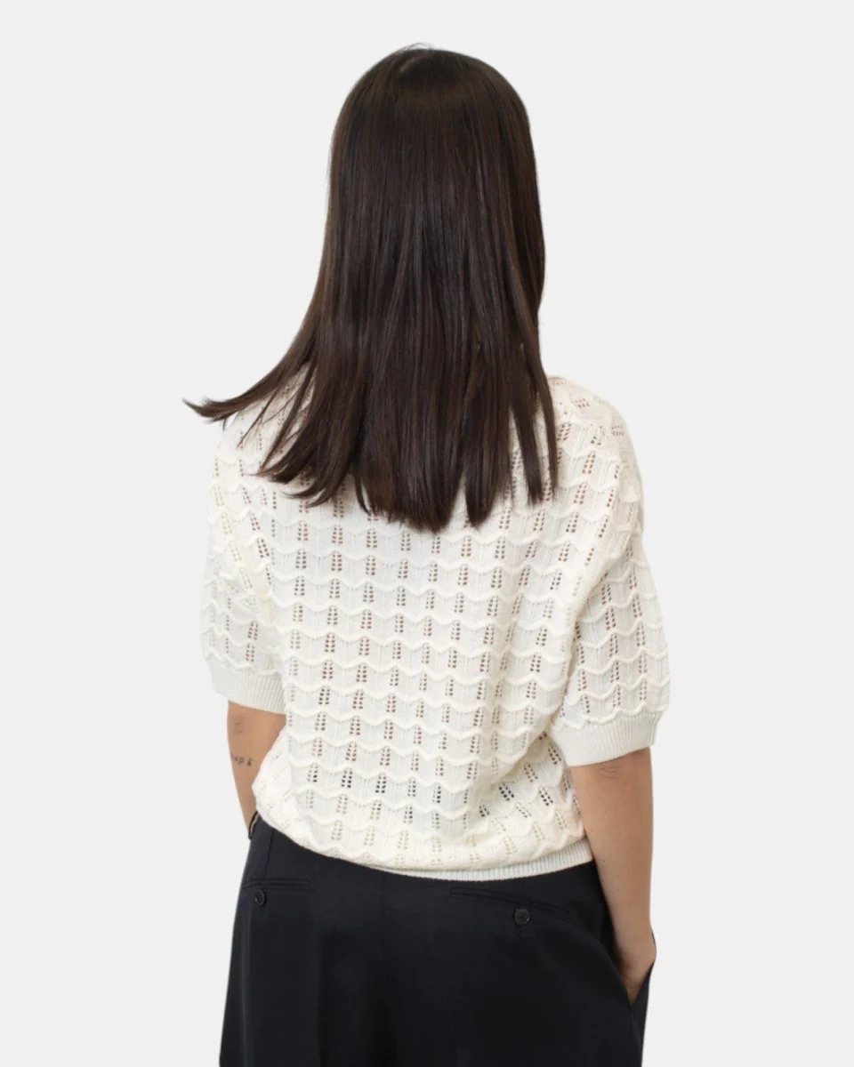 La polo a maniche corte di Daniele Fiesoli presenta maniche e fondo a costine, fantasia a losanghe traforate, giro sceso, dalla mano fresca dovuta alla sua composizione in 65% lino e 35% cotone. Si consiglia lavaggio a mano. La modella è alta 1,68 m e indossa una S