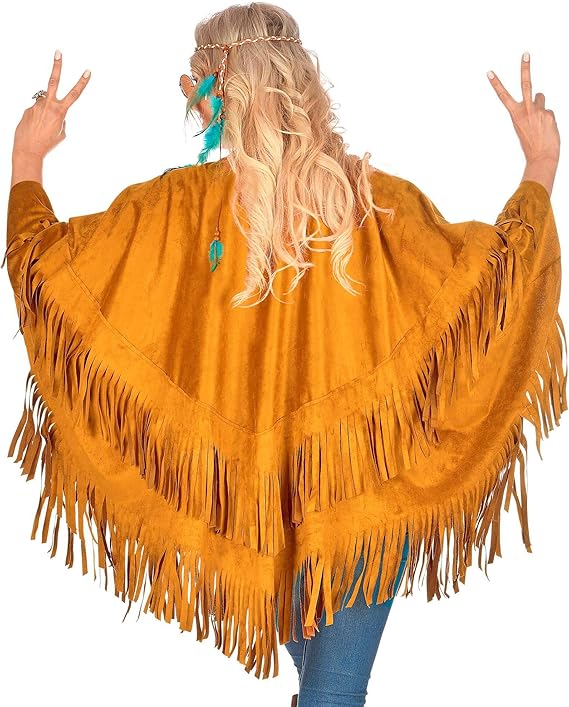 - Include il poncho dal taglio ampio e con numerose frange lunghe
