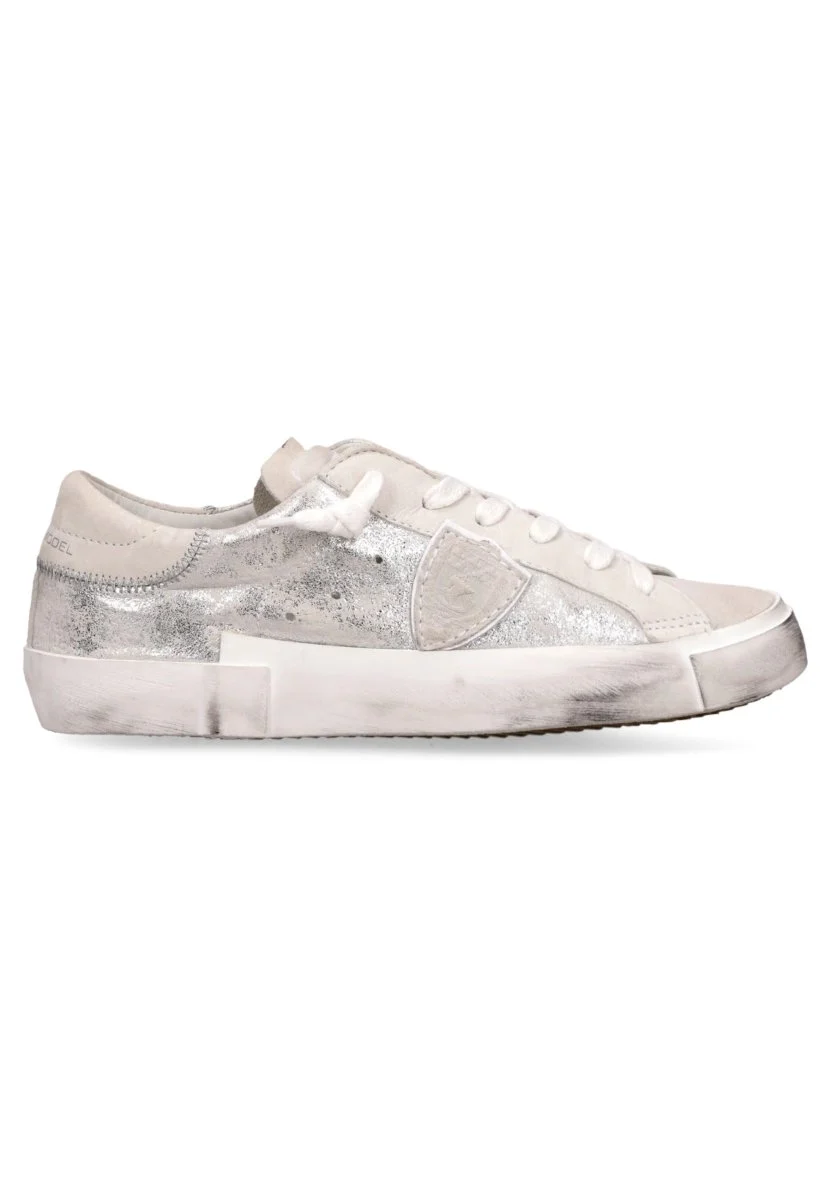 Le Philippe Model PRSX sono la massima espressione dello streetwear di lusso, un’icona contemporanea che fonde design urbano e artigianalità italiana. Questo modello, tra i più riconoscibili del brand, si distingue per una tomaia dal carattere deciso, realizzata in un mix esclusivo di suede taupe e pelle laminata color argento metal, rifinita con cuciture zig zag a contrasto e traforature con vele metalliche che delineano lo scudo laterale embossed. Ogni dettaglio è pensato per creare un’estetica audace e sofisticata, perfetta per chi cerca sneakers Philippe Model effetto vissuto con un’anima cool e raffinata.