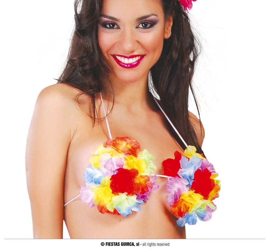 Ottimo accessorio femminile utile al travestimento in occasione di un Flower Party, di una festa in spiaggia a tema Tropicale o Hawaiana. Il reggiseno infatti, si presenta in diversi colori ma soprattutto decorato con fiori diversi in maniera tale da presentarsi al party senza aver lasciato nulla al caso, garantendo un effetto eccellente. Ideale anche in occasione di Carnevale o di qualsiasi evento in maschera o costume. Perfetto se abbinato ad una collana hawaiana o un pareo in paglia.