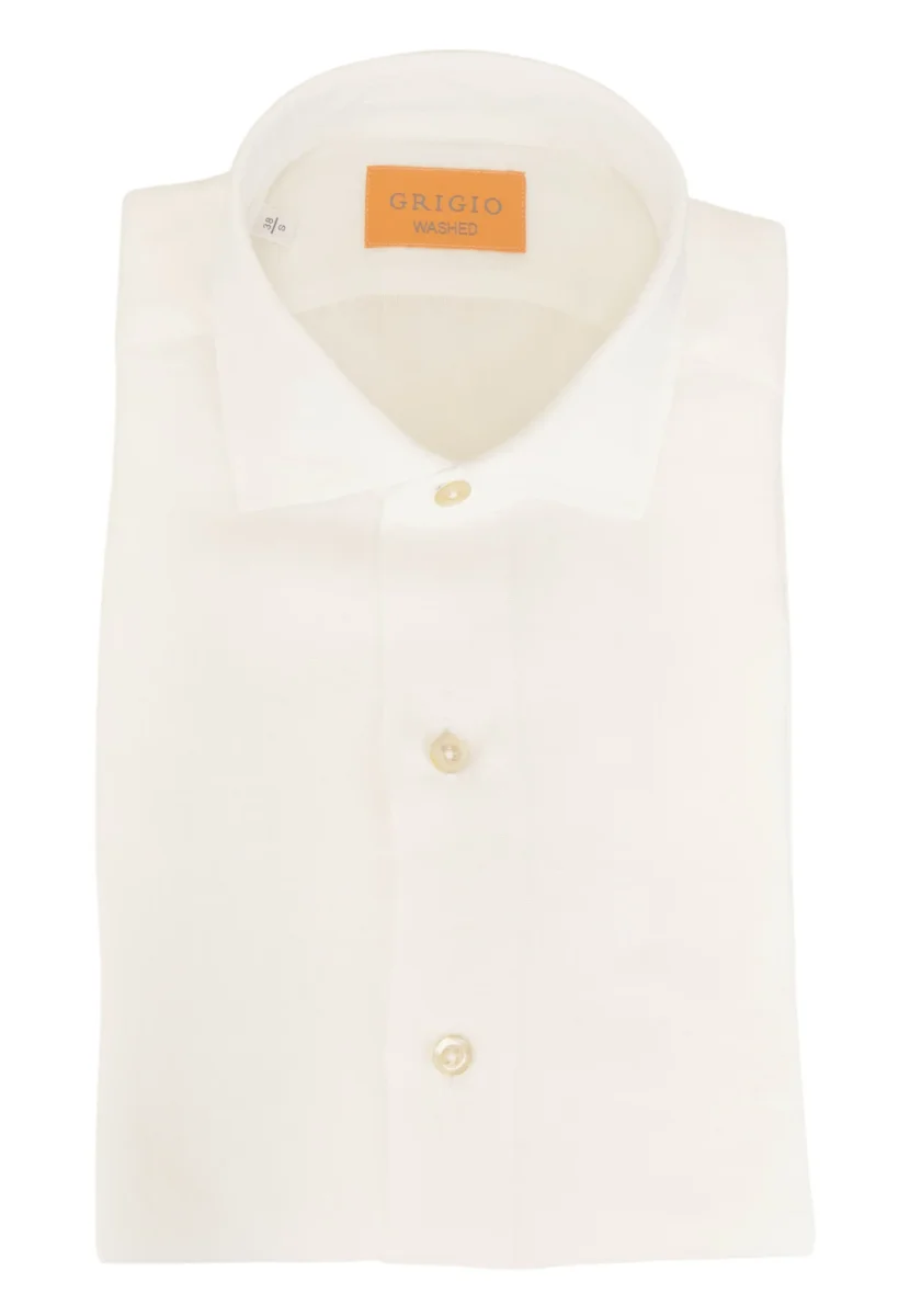 Il design è valorizzato dal collo francese, elegante e versatile, adatto sia a look casual che più curati. I bottoni in madreperla aggiungono un dettaglio ricercato che esalta la qualità del capo, mentre le pinces contribuiscono a definire una linea pulita e armoniosa. Il trattamento lavato dona alla camicia un aspetto morbido e leggermente vissuto, perfetto per uno stile sofisticato ma disinvolto.
