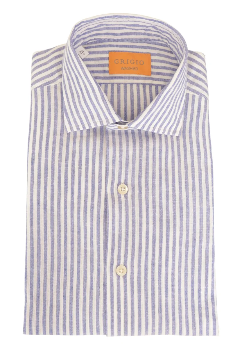 Il collo francese aggiunge un tocco di eleganza contemporanea, mentre i bottoni in madreperla valorizzano il design con un dettaglio ricercato. La vestibilità regolare garantisce comfort e libertà di movimento, adattandosi facilmente a diverse fisicità. La fantasia a righe azzurra e bianco conferisce carattere al capo, rendendolo perfetto sia per outfit casual raffinati che per abbinamenti più formali.