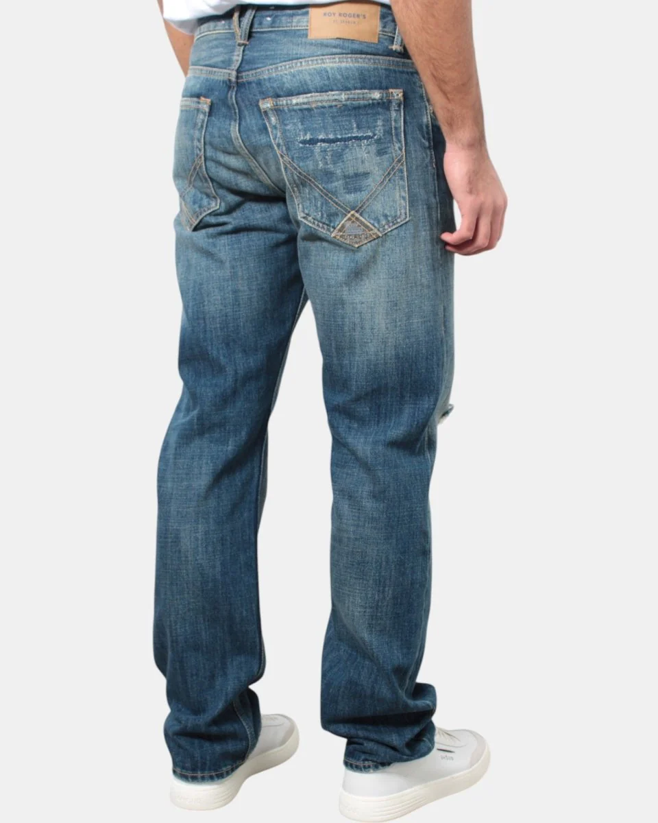 Il jeans di Roy Roger’s presenta due tasche frontali e due tasche a toppa sul retro, spacchi sia sul fronte sia sul retro dovuti al lavaggio, macchie di vernice in contrasto col jeans, chiusura con zip e bottone , vestibilità regular. La composizione è in 100% cotone. Si consiglia il lavaggio a secco. Il modello è alto 1,79 m e indossa una 31