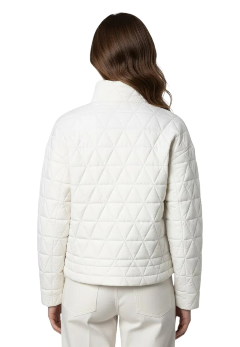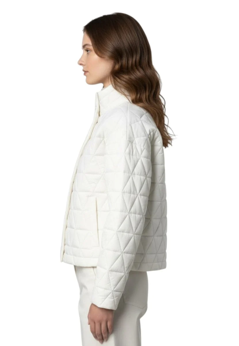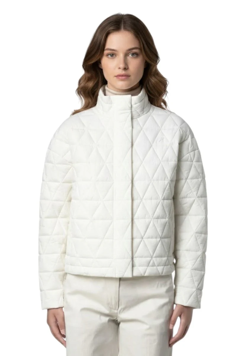 La Sabrina Diamond Quilted Warm – X42 White Gardenia di K-WAY è la giacca corta perfetta per affrontare la mezza stagione con eleganza e funzionalità. Il design femminile e moderno, con fondo dritto e trapuntatura a triangoli, dona al capo un look pulito e raffinato, ideale per un uso quotidiano versatile.