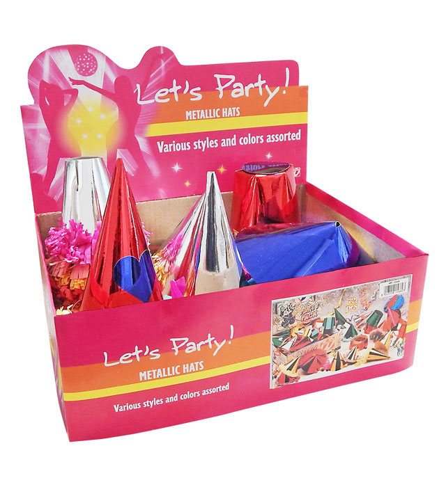 Questo è l’espositore con cappelli metallizzati. I cappelli sono ordinati per colore e forma. Non è possibile effettuare una preselezione. Perfetti per carnevale, feste a tema o altri eventi. Questi cappelli sono sempre un successo anche alle feste di compleanno dei bambini.