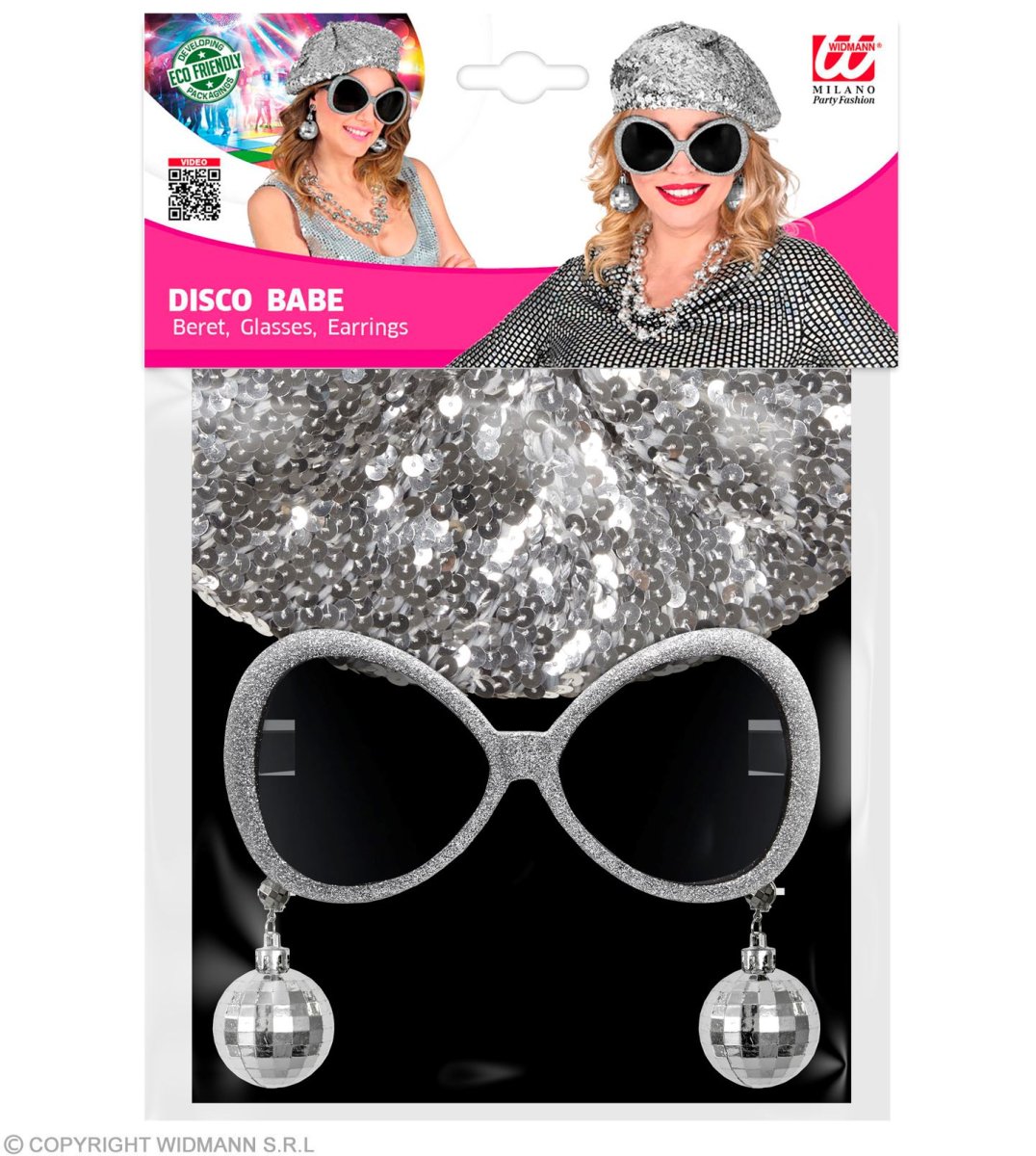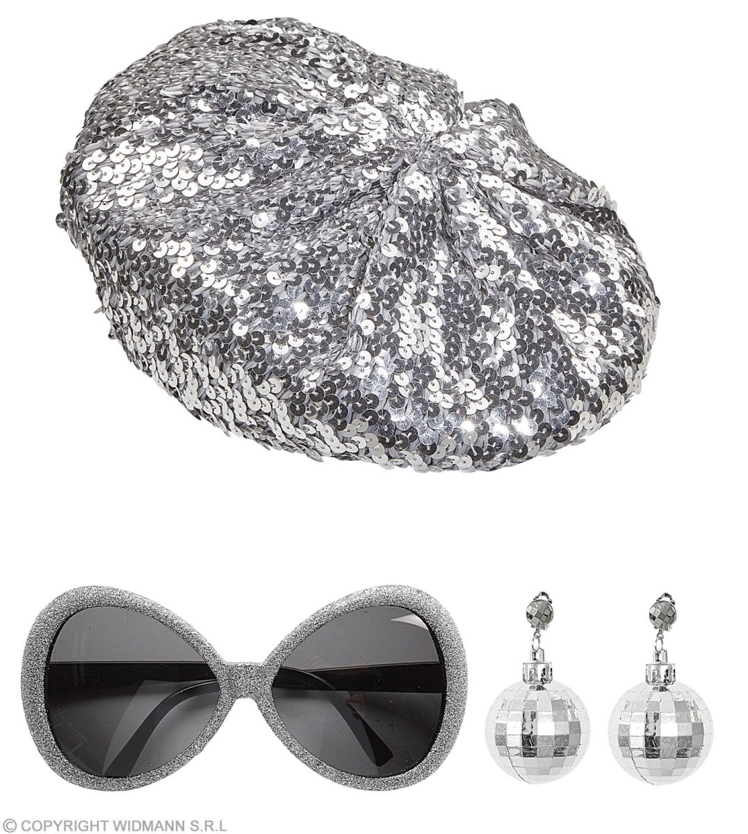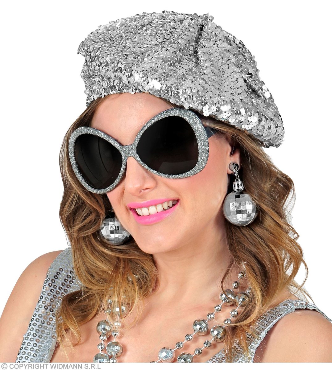 Set Disco Babe basco in paillettes, occhiali , orecchini sfera stroboscopica