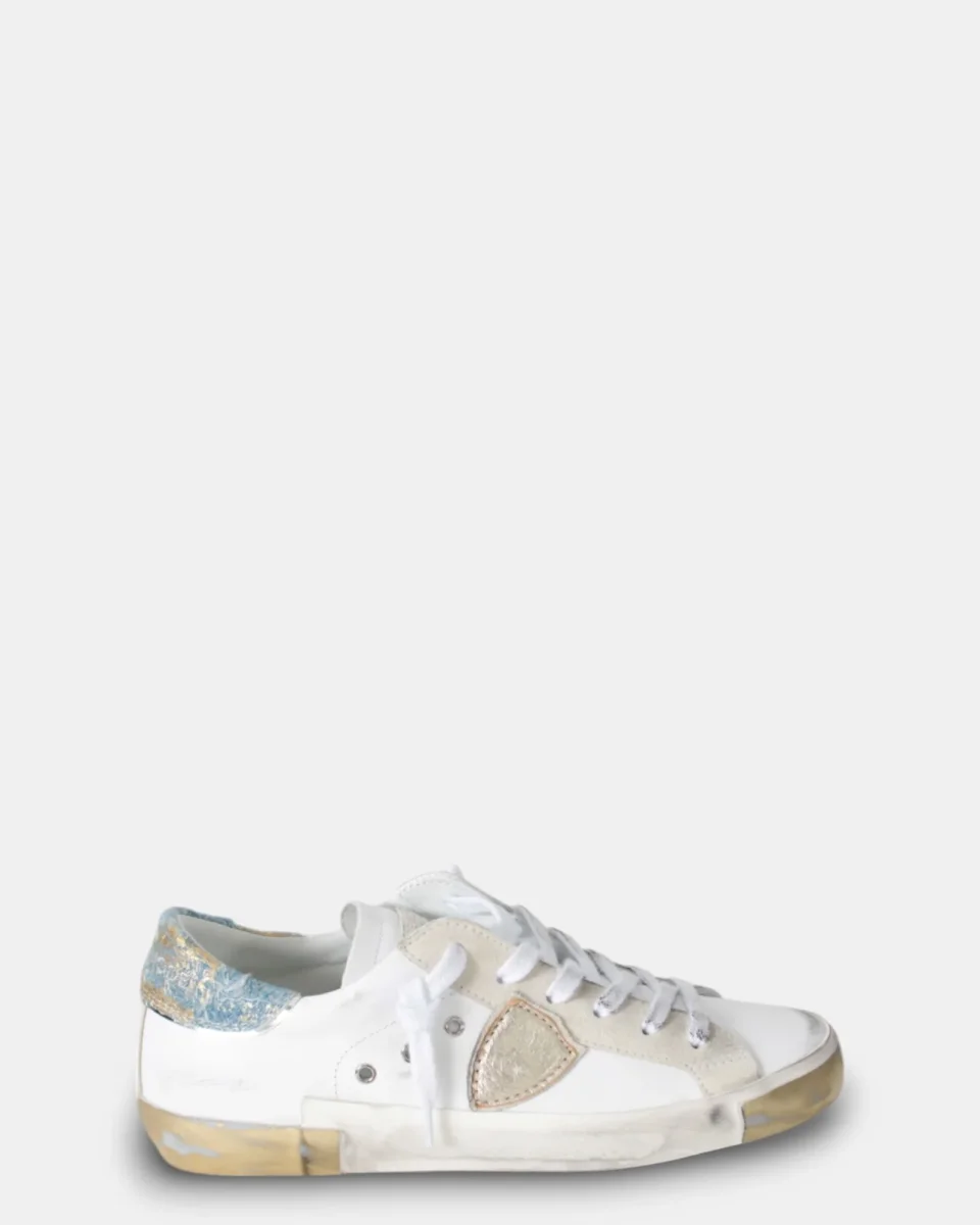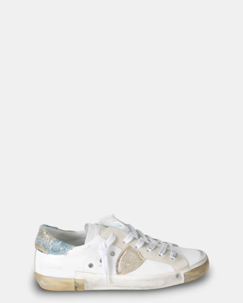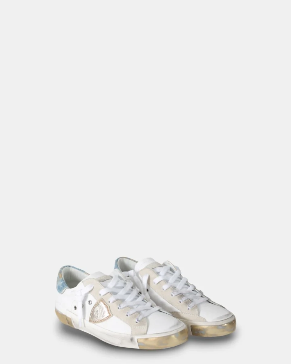 modello: sneakers prsx low woman philippe model con topponcino in denim laminato e usurato, fasciatura rifinita a mano, con dettagli laminati su punta e tallone.