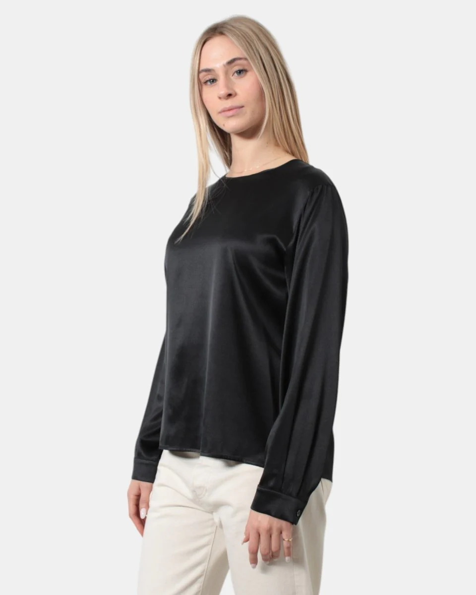La maglia a maniche lunghe di Solotre presenta uno scollo sul retro con chiusura a un bottone dall’effetto morbido e avvolgente dovuto alla sua composizione in 92% seta e 8% elastan. Si consiglia di non lasciare il capo in ammollo. La modella è alta 1,67 m e indossa una 44