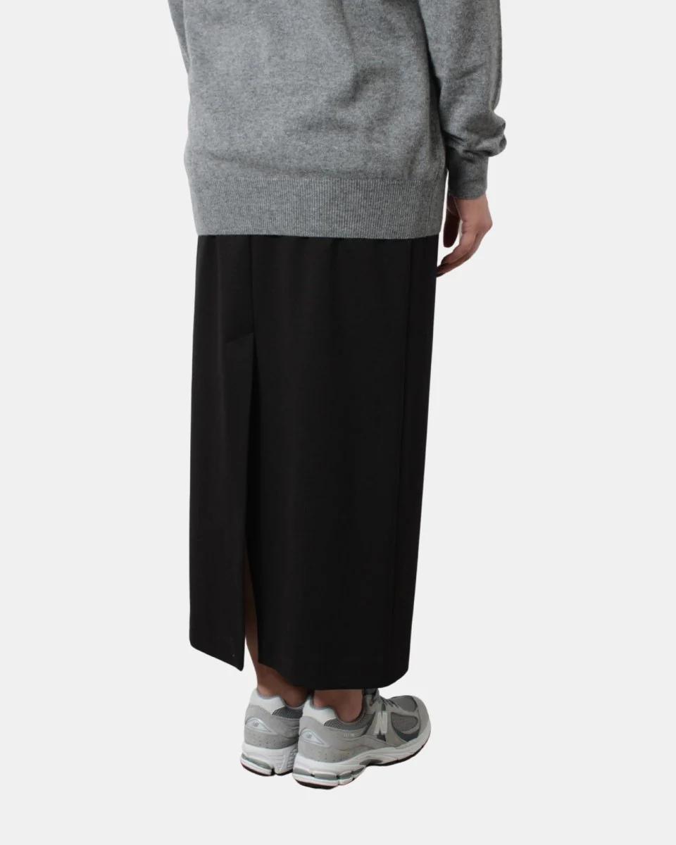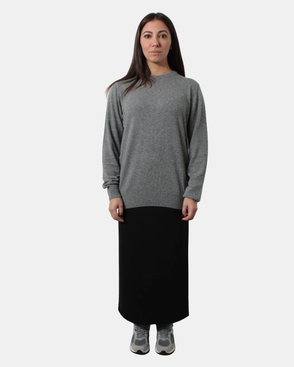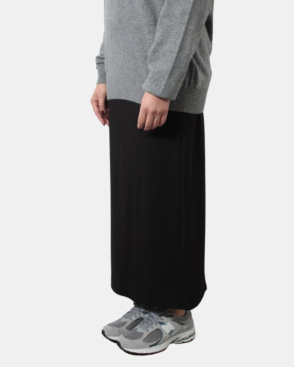 La gonna lunga di Solotre con spacco posteriore e chiusura posteriore con zip , dalla sua composizione in 65% viscosa , 30% poliammide e 5% elastan. La modella è alta 1,67 m e indossa una 42
