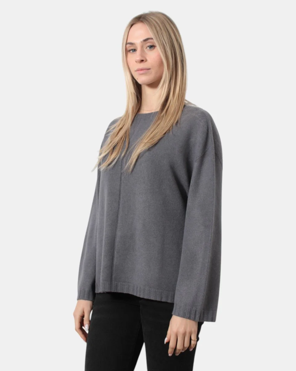 La maglia a girocollo di Solotre presenta collo, polsi e fondo a coste, e una striscia in tinta in rilievo al centro della parte frontale, dalla mano soffice e calda dovuta alla sua composizione in 65% viscosa, 27% poliestere e 8% angora. Si consiglia lavaggio a secco. La modella è alta 1,67 m e indossa una III