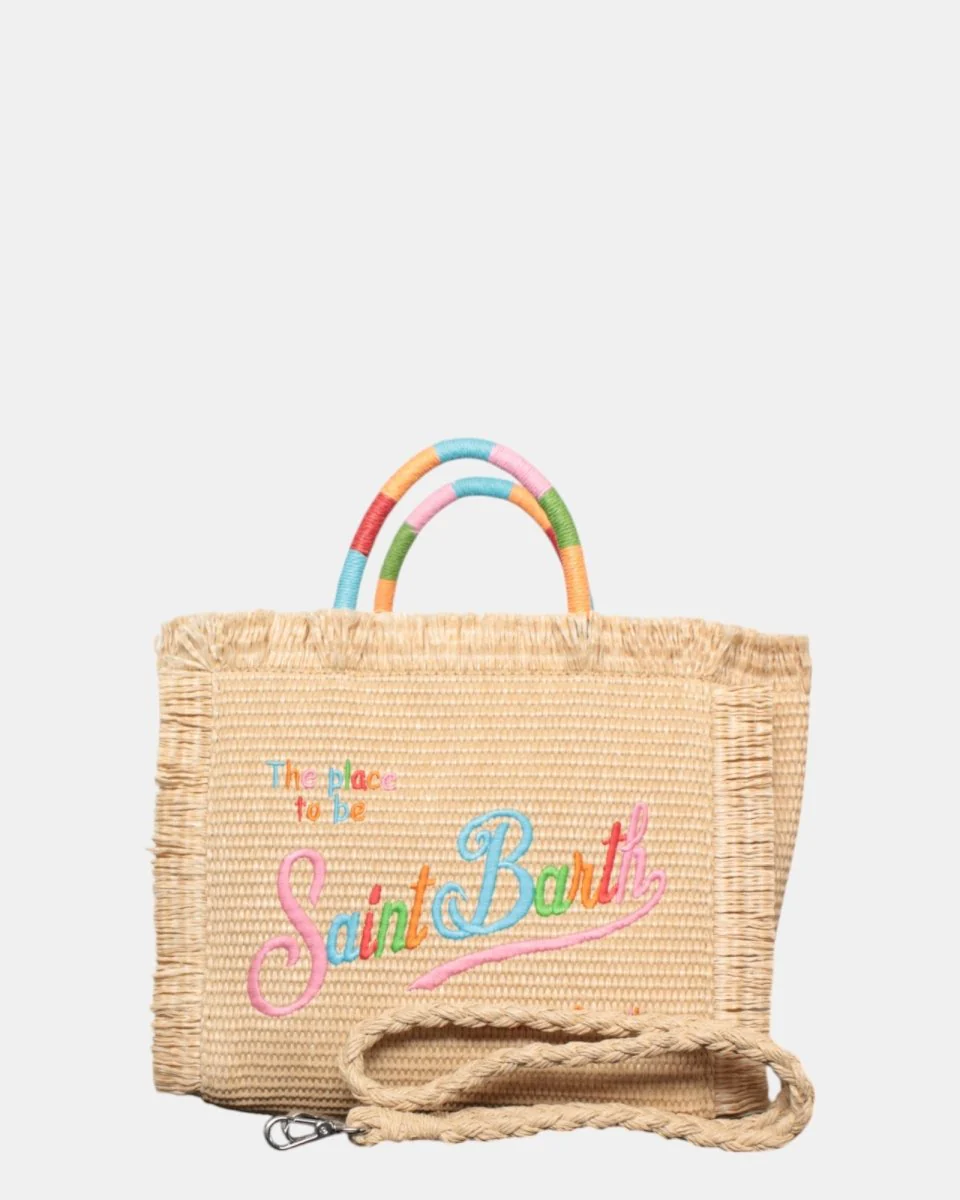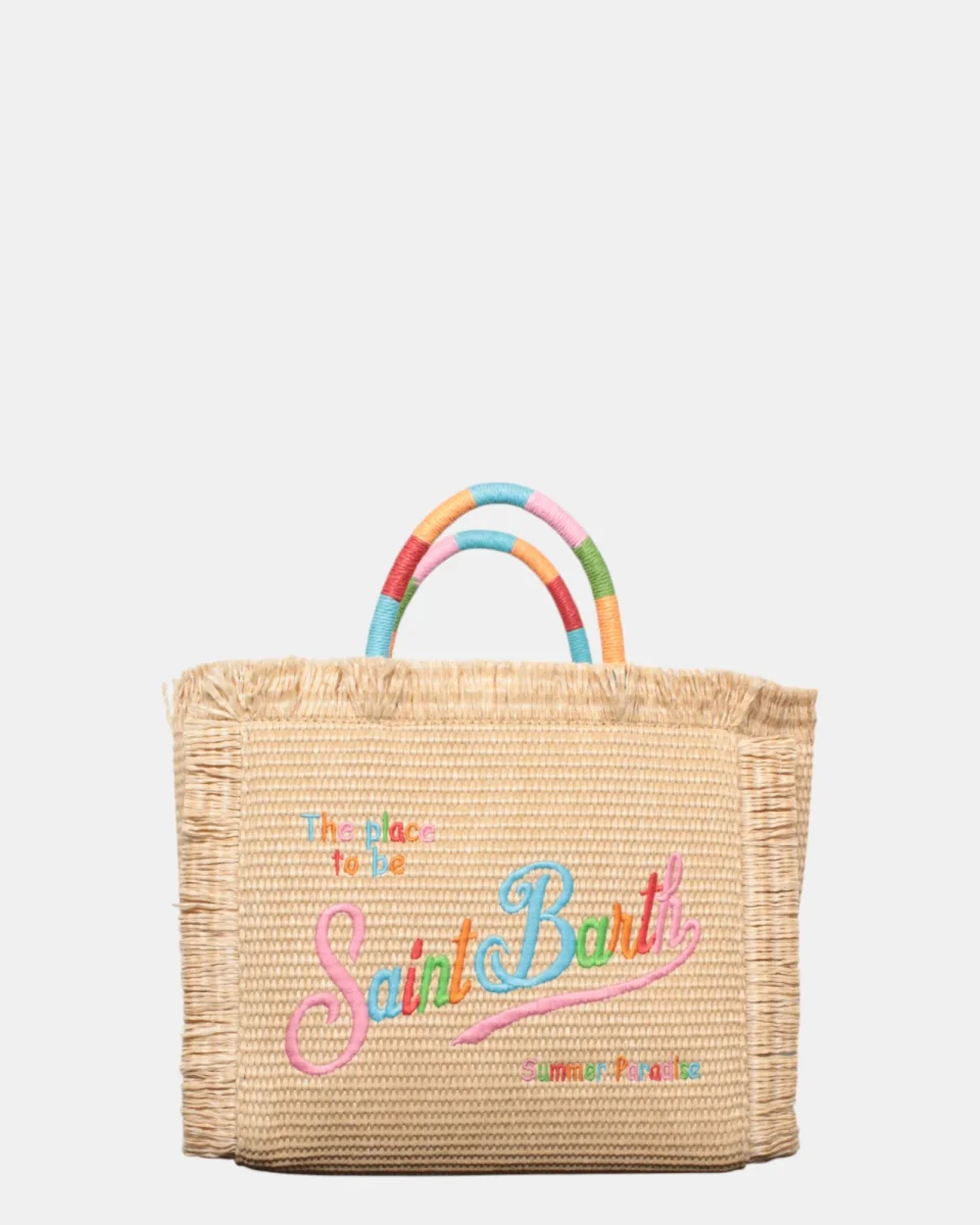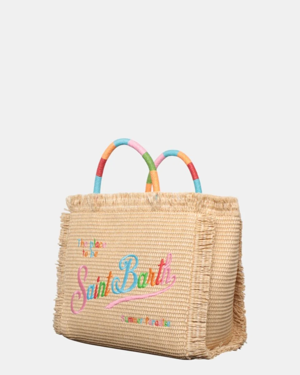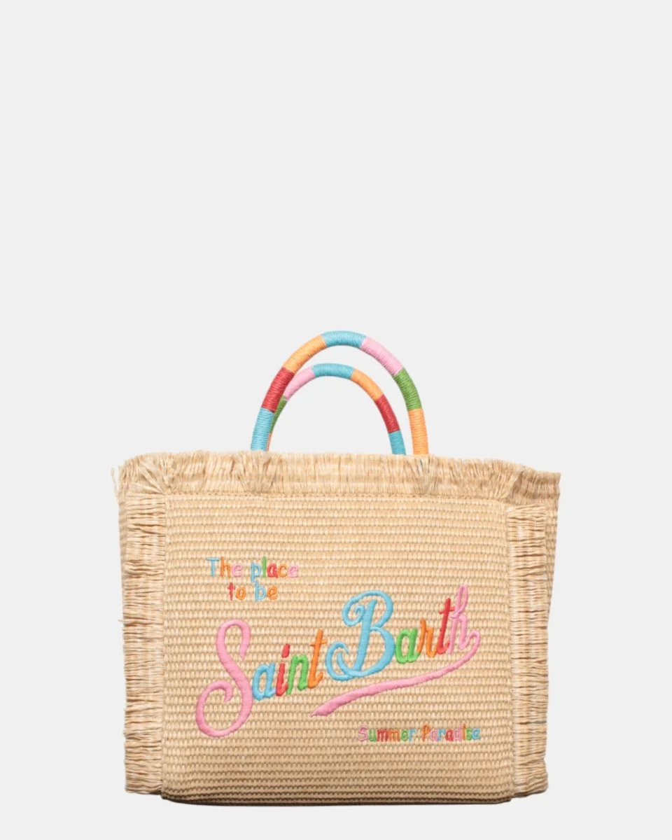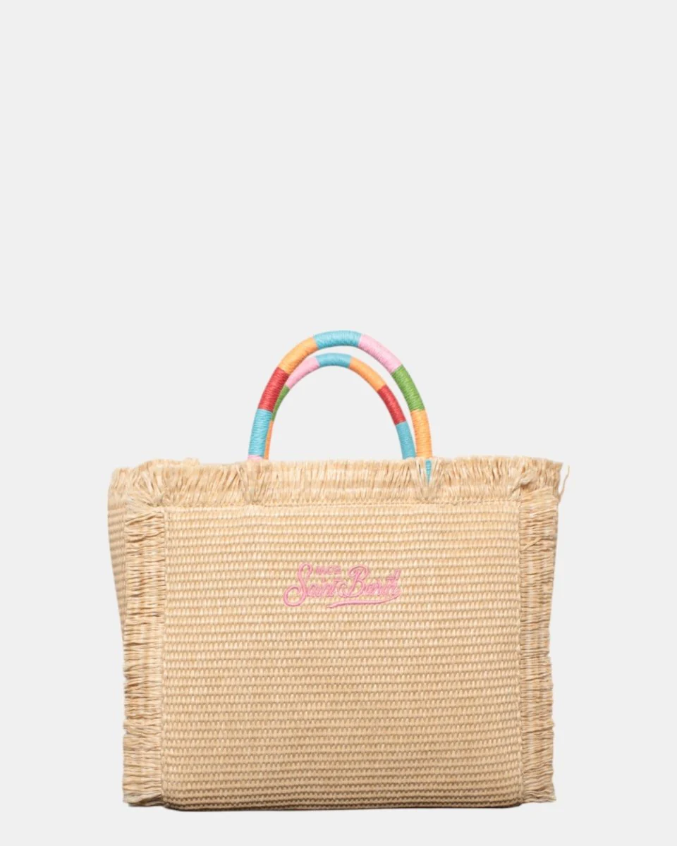 La borsa in paglia di MC2 Saint Barth presenta logo brand con scritta su ambo i lati in contrasto, frange sui lati della borsa, zip interna