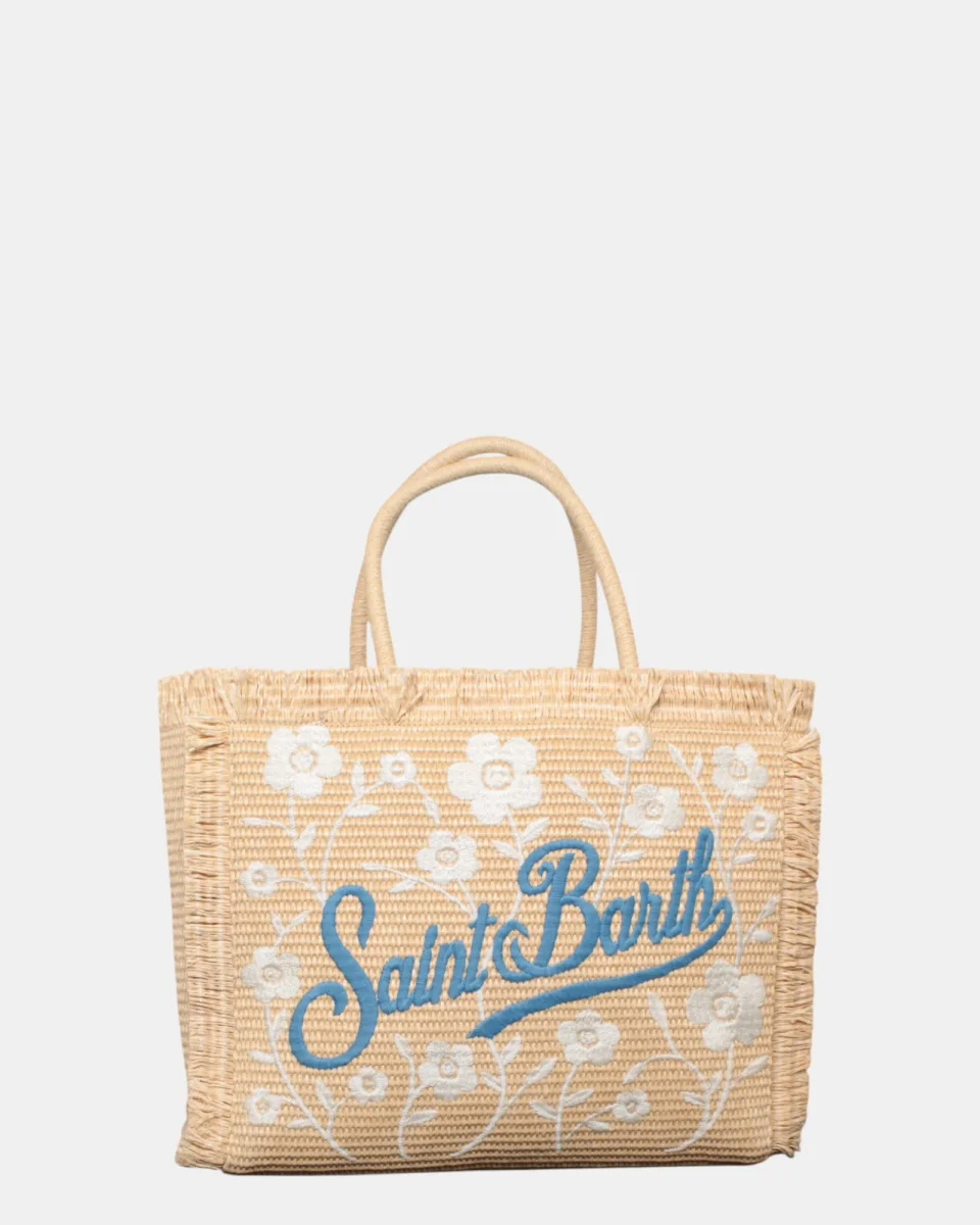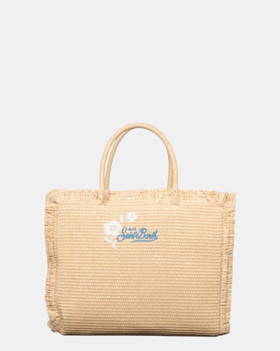 La borsa grande in paglia di MC2 Saint Barth presenta logo brand con scritta su ambo i lati in contrasto, frange sui lati della borsa, zip interna. Dimensioni: 33 x 27 x 13 cm