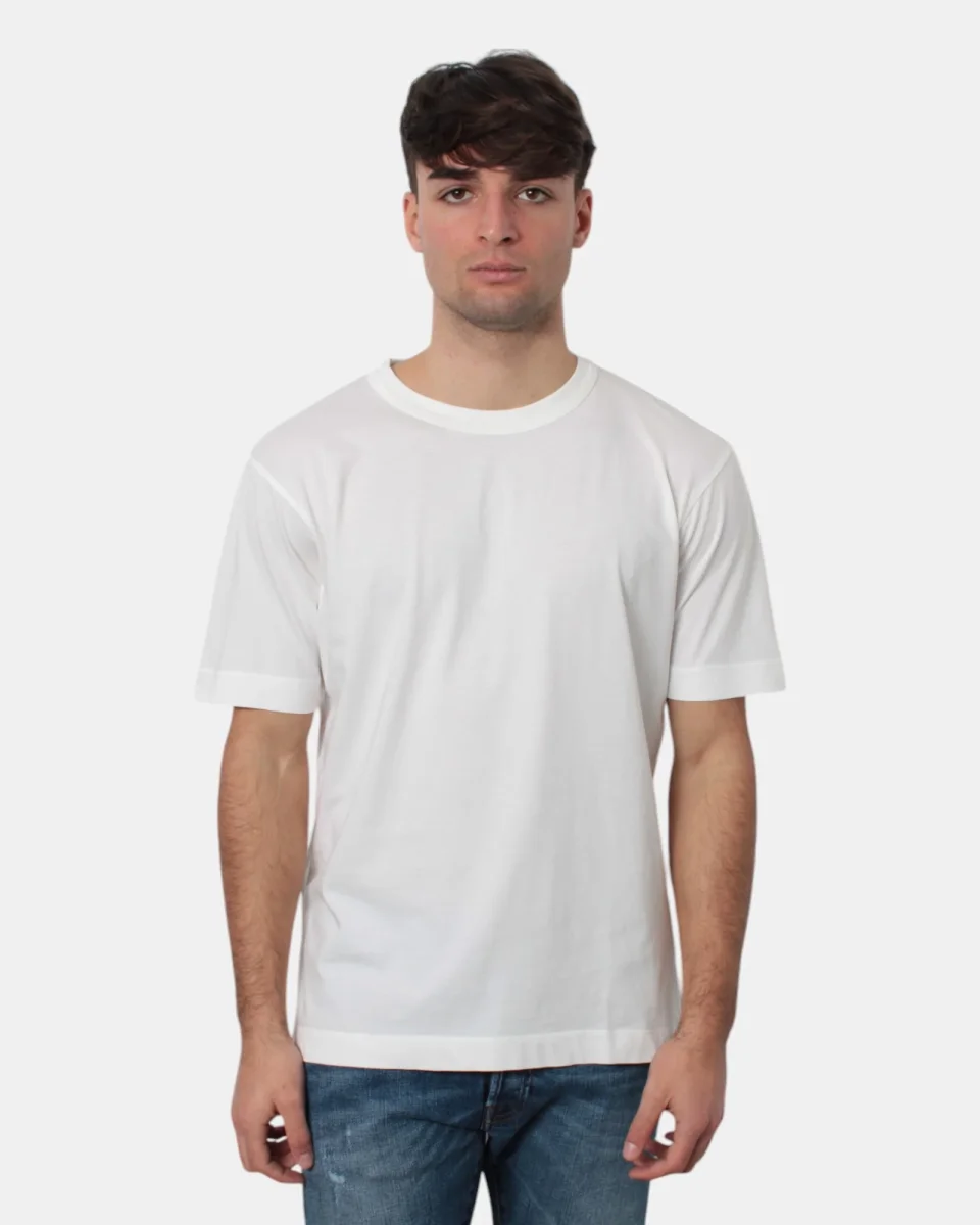 La T-shirt di Daniele Fiesoli presenta fantasia monocolore, dalla mano fresca e morbida dovuta alla sua composizione in 100% cotone, si consiglia lavaggio a mano. Il modello è alto 1,78 m e indossa una L