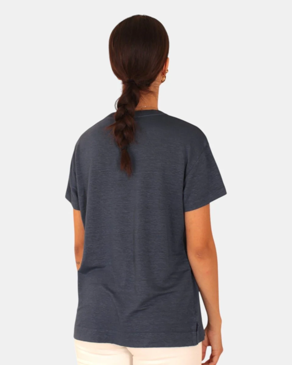 La t-shirt di Daniele Fiesoli presenta fantasia monocolore, due spacchetti laterali, dalla mano fresca dovuta alla sua composizione in 94% lino e 6% elastan. SI consiglia lavaggio a mano. La modella è alta 1,68 m e indossa una S