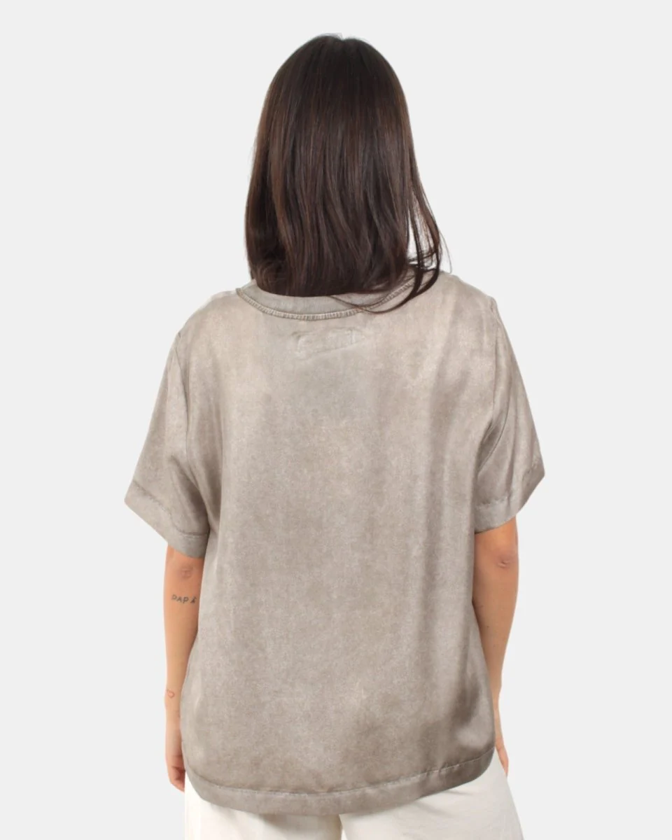 T-shirt Jucca in satin grigio stampato, con scollo a giro e maniche corte. Tessuto fluido e vestibilità regolare. Composizione: 100% seta. Si consiglia lavaggio delicato a massimo 30 gradi. La modella è alta 1,68 e indossa una 44.