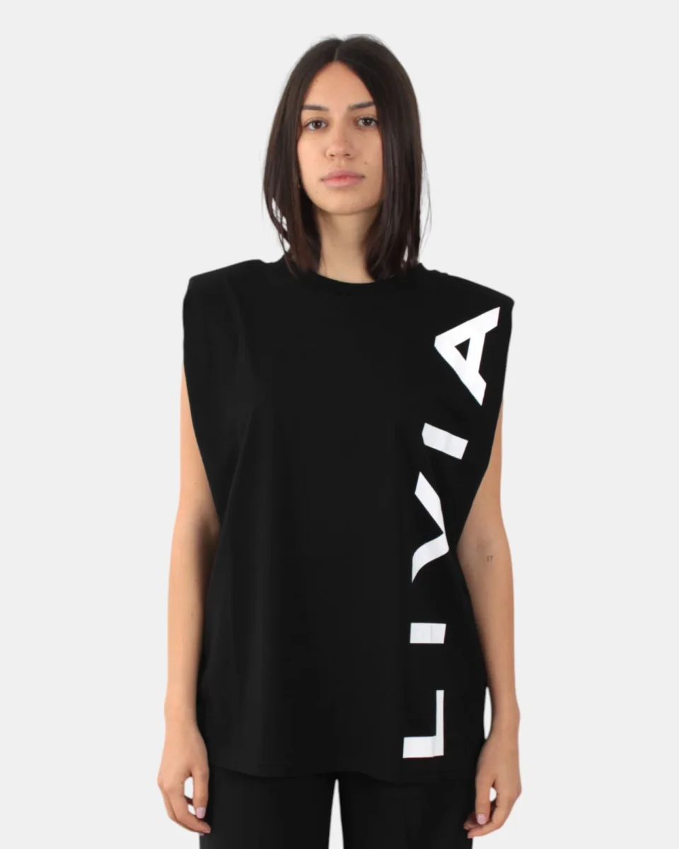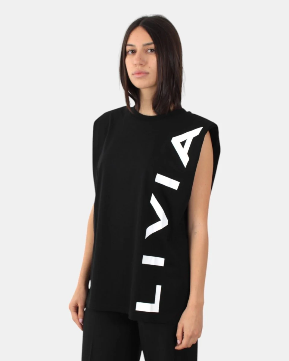 La t-shirt smanicata di Liviana Conti presenta fantasia con scritta brand in contrasto, dalla mano fresca dovuta alla sua composizione in 100% cotone. Si consiglia lavaggio a mano. La modella è alta 1,68 m e indossa una S