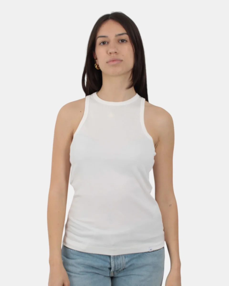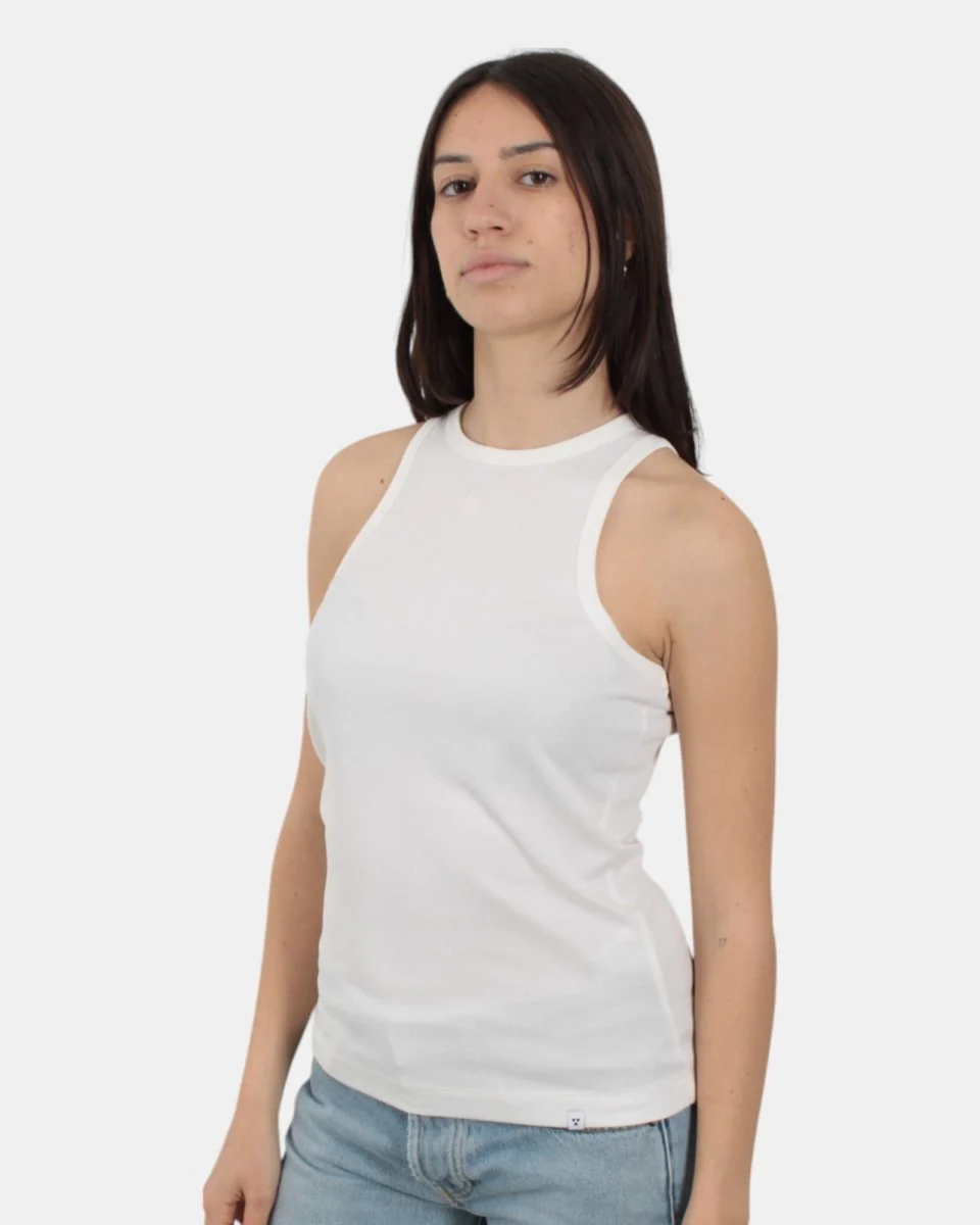 La canotta di Woc presenta fantasia monocolore a costine, dalla mano fresca dovuta alla sua composizione in 68% modal e 32% pem riciclato. Si consiglia lavaggio a massimo 30 gradi. La modella è alta 1,68 m e indossa una S