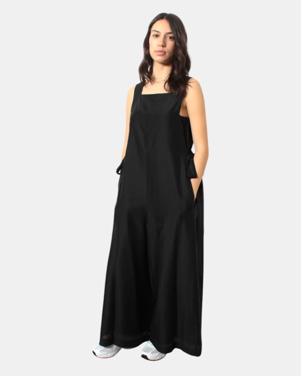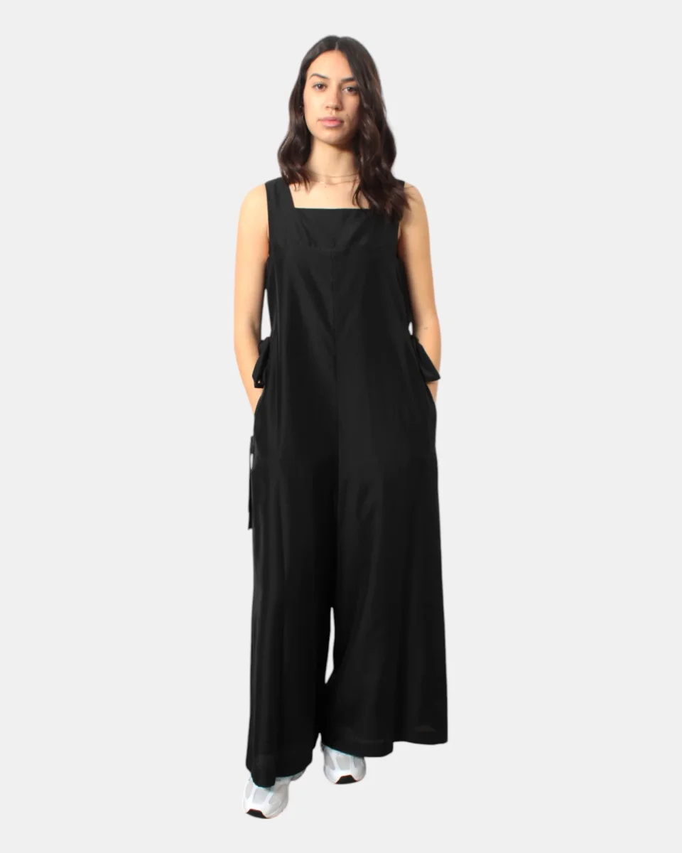 La tuta di Meimeij presenta fantasia monocolore, vestibilità regolare, fiocchetti su ambo i lati, dalla mano fresca dovuta alla sua composizione in 85% lyocell e 15% poliestere, si consiglia lavaggio a massimo 30 gradi. La modella è alta 1,68 m e indossa una 40