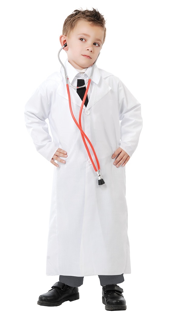 Costume bambino dottore . La confezione comprende: camice, pettorina con cravatta e mascherina . Sono esclusi gli altri accessori