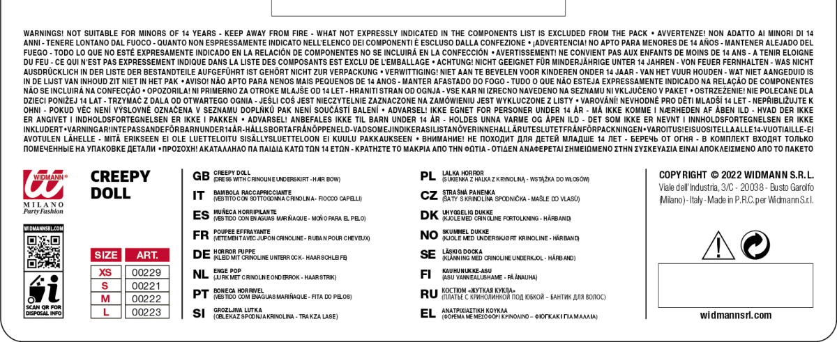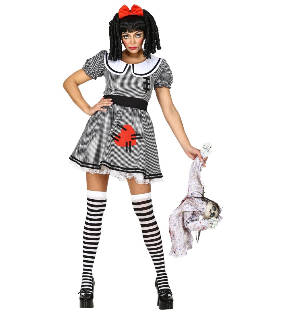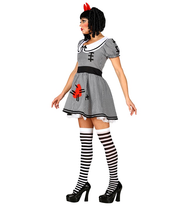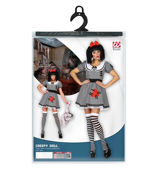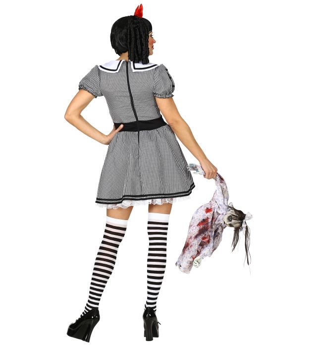Costume Bambola Raccapricciante da Donna composto da: vestito con sottogonna crinolina, fiocco capelli; ideale per travestimanti ad halloween, carnevale, tutte le feste in maschera. Lavare a mano; Non stirare; No candeggina, asciugatrice o lavaggio a secco.