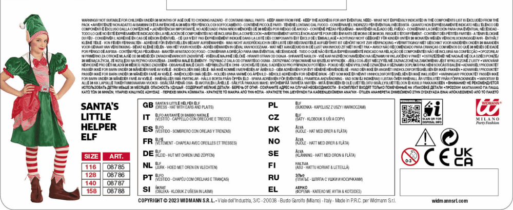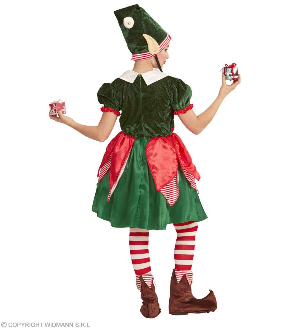 Costume ELFO AIUTANTE DI BABBO NATALE . La confezione comprende: vestito, cappello con orecchie e trecce . Sono esclusi gli altri accessori