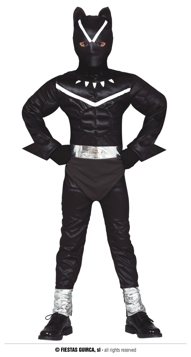 COSTUME Pantera Nera SUPEREROE FELINO . La confezione comprende: tuta con cappuccio e mantello. Sono esclusi gli accessori non menzionati.
