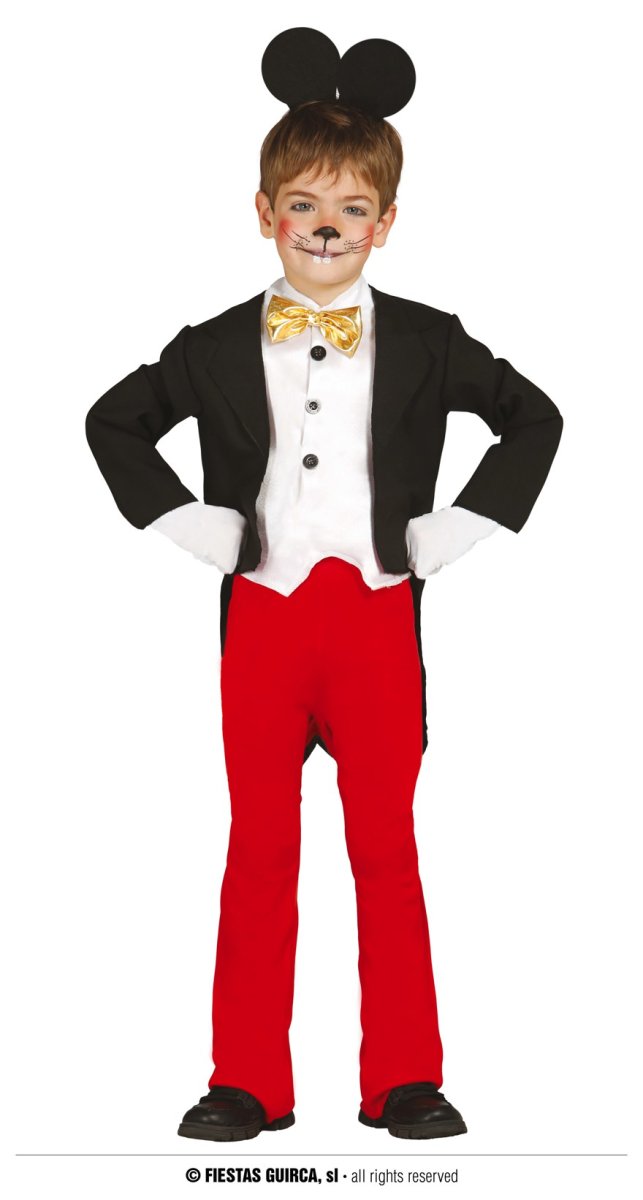 Costume in poliestere composto da giacca modello frac, pettorina con papillon, pantaloni con elastico in vita e cerchietto con orecchie. Guanti e make up acquistabili separatamente.