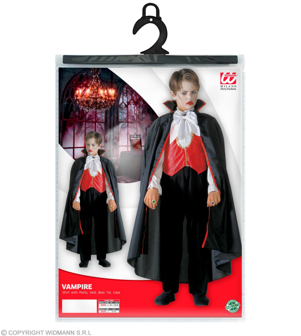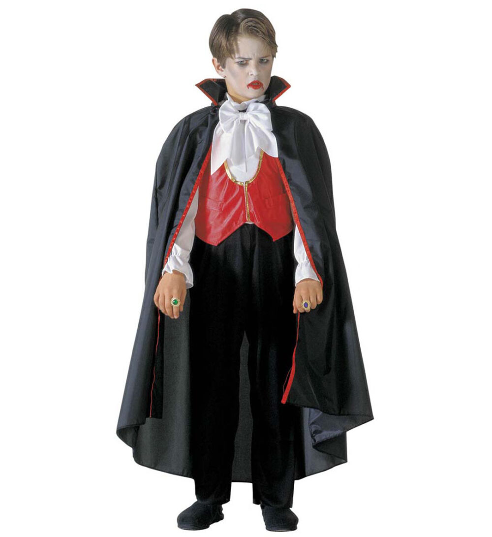 Costume Vampiro per halloween, composto da mantellina in raso nero con collare, camicia con jabot e gilet applicato in raso rosso, pantaloni in maglina nera e farfallino.