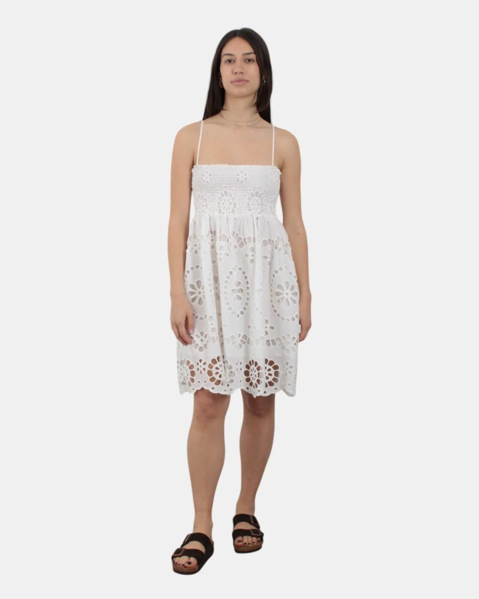 Il vestito di MC2 Sainth Barth presenta fantasia traforata con dettagli brand, ricami in rilievo, dalla mano fresca dovuta alla sua composizione in 100% cotone. Si consiglia lavaggio a massimo 30 gradi. La modella è alta 1,68 m e indossa una S